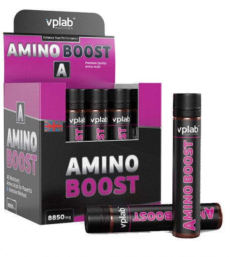 Amino Boost от VP LABORATORY - это жидкие концентрированные аминокислоты, содержащие пептиды глютамина, BCAA, L-орнитин, L-аргинин и 9,7 г свободных аминокислот и пептидов в ампуле.